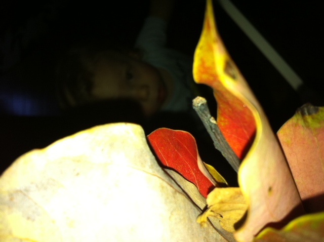 So after my drive home tonight when 2 people, not one but two, pulled up on my left as I was waiting to turn left onto one of the busiest streets in LA and went to turn in front of me (one was an older lady who I forgive because of her age, but the other lady literally just smirked at me….uggghhh…to which I then pulled my car closer to theirs and then cut out in front of them while honking wildly – charming I know), I arrived home and as it always does when I walk in to find my minis in the kitchen with Nana H., I feel a touch lighter. I gave kisses and we all moved into the living room. As we practiced Q’s newly acquired walking skills on which he is improving, but still has a way to go, he suddenly lost his balance and fell back and smacked his overly large head on the hard wood floor. The thump resonated throughout the floor and up into my bones. I did the instant assessment of “is this truly painful or just scary a combo. Should I celebrate and cheer or scoop him up because he is actually hurt”. In about 1 second I deduced that it was a combo but that a scoop up was in order, so I grabbed him and pressed him against me to comfort the screaming and crying with crocodile tears. The fear was stronger in this case than the pain so I decided that a trip outside would be a good cure for this wound. So off we went. As we walked down the steps, we stopped at our tree to see the leaves and then kiss them. We moved on enthusiastically to other leaves. Then is was time to get “dan” (down in Q) and off he went into the grass. He excitedly 3 toed slothed his way across the grass to grab a leaf, which he excited stretched his arm up to me to hand it to me. He then did the same thing again, and again, and again and again. He crawled all over the grass and then decided to hop the brick path, and by hop I mean me holding him by one arm so he wouldn’t end up face down in the dirt lining the path, where he quickly started handing me more leaves. I looked down and started making a leaf bouquet. I thought about it so closely resembled those bouquets you make with ribbons from the shower gifts you get before you get married. Then he handed me a leaf that was not like the others. It was old and crispy and gnawed away in spots. I thought about throwing it back on the grass where Q couldn’t see it, but I realized in that moment, that to him the leaf was just as pretty as the others so I kept it in and continued to add the others while keeping that leaf on the top. During this whole time, I had left my phone inside. I couldn’t check email or answer my phone if it rang, it was truly peaceful. Just me and Q and our leaf bouquet.