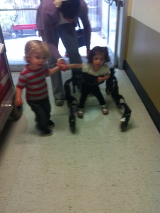 Q takes his sister’s hand in her walker…because he knows we all learn to walk before we run.